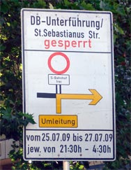 Am Wochenende (25.07. bis 27.07.) wird die Sankt-Sebastianus-Straße in Wahn wegen Bauarbeiten gesperrt. Die Sperrung gilt von Samsatg Abend bis Montag Morgen jeweils von 21:30 Uhr bis 4:30 Uhr und betrifft die Zufahrt nach Wahn über die Eisenbahnunterführung an der Ecke Liburer Landstraße / Wahner Straße und von Wahn aus die Anbindung an den Bahnhof Wahn über die Sakt-Sebastianus-Straße (der Bahnverkehr zwischen Wahn und Spich ist offenbar nicht beeinträchtigt).