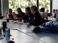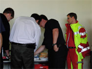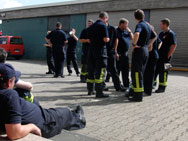 Im Anschluss an die erste Übung trennten sich die Wege von Rettungsdienst und Feuerwehr wieder, die Einsatznachbesprechung stand an. Das rettungsdienstliche Vorgehen ist ganz klar der Schwerpunkt im MANET-Projekt, die Arbeit der Feuerwehr „nur“ schmückendes Beiwerk. Dementsprechend wurden die Kameraden vom Rettungsdienst intensiv befragt, um ihre Erfahrungen auswerten zu können. Bei der Feuerwehr verlagerte sich die Diskussion eher in den einsatztaktischen Bereich, Fachsimpeleien und Planungen für die anstehende zweite Übung standen im Vordergrund.