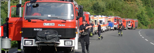 Löschfahrzeuge verschiedenster Bauart, mehrere Rettungswagen und neben unserem Rüstwagen auch der RW1 der Löschgruppe Dünnwald. Kurz darauf ertönte ein Signalhorn – der Startschuss zur Übung war gefallen.