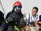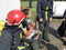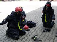 Einer der Trupps in voller Montur. Die Feuerwehr Köln hält spezielle Ausrüstung für die Wärmegewöhnung vor.Der Durchgang durch die Wärmegewöhnungsanlage gestaltet sich überraschenderweise viel aktiver als vermutet. Die Feuerwehr Köln hat nicht nur mehrere Seecontainer gestapelt, sondern gleich ein paar Attraktionen eingebaut. Jeder Kursteilnehmer transportiert einen Feuerlöscher durch die Anlage, quetscht sich durch zwei Wände aus Reifen und ertastet vorsichtig – teilweise ohne Sicht – eventuelle Bodenhindernisse. Bei allen Aufgaben wird natürlich im Trupp gearbeitet, gegenseitige Unterstützung macht vieles einfacher. Zwischendurch weist der Ausbilder auf die Wirkung der Hitze hin, der Temperaturanstieg vom Boden bis in Stehhöhe wird deutlich. Irgendwann taucht eine Treppe aus dem Rauch auf, die in das „Obergeschoss“ der Anlage führt. Dort oben ist die Wärmeeinwirkung schon grenzwertig, während man noch kniet - in aufrechter Position kann man nicht lange verharren.