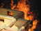 Blick auf das Feuer im Brandraum. Das Foto ist durch ein Loch im Container aufgenommen worden - eine Kamera mit in die Anlage zu nehmen würde dem Gerät sicher nicht bekommen.Nach der ersten Begegnung mit der vollen Hitze folgt ein weiterer Rundgang durch die Strecke. Diesmal ohne Feuerlöscher, dafür aber mit mehr Tempo. Zwischendurch fragt die Atemschutzüberwachung den niedrigsten Flaschendruck ab, dann geht es weiter. Am Ende wartet noch einmal der Brandraum. Über ein bereitliegendes Hohlstrahlrohr gibt der Ausbilder kurz Wasser ab. Das Feuer - davon kaum beeindruckt - brennt scheinbar