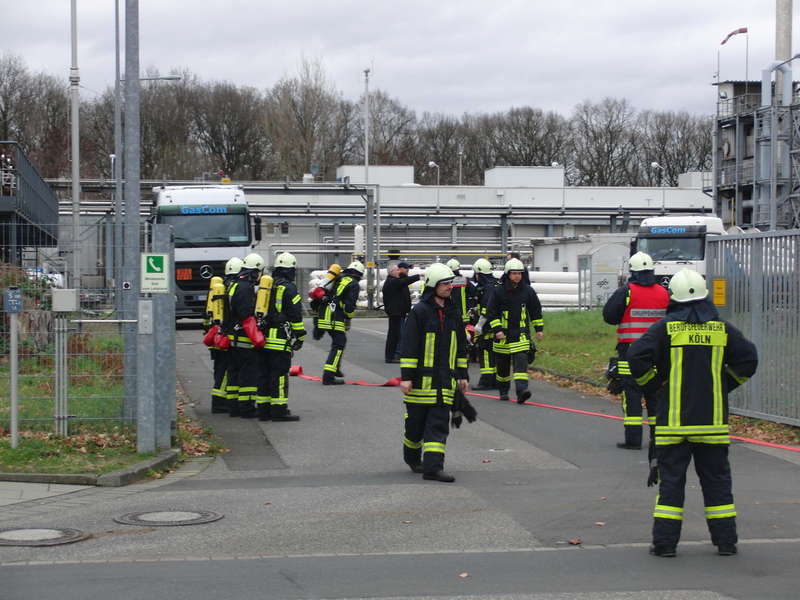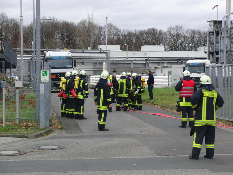 Durch die geänderte Lage bricht der Angriffstrupp seine Erkundung ab. Der Einsatzleiter entscheidet, dass der Angriffstrupp und ein weiterer Atemschutztrupp mit je einem C-Rohr zur Kühlung der umliegenden Behälter vorgehen sollen. Als beide Trupps gerade ihre Stellungen eingenommen hatten, wurde bekanntgegeben, dass auf dem Übungsgelände zwei Personen vermisst werden. Der Atemschutztrupp des Löschgruppenfahrzeugs der Feuerwache 7 machte sich daher auf die Suche nach den Vermissten, die wenig später auch gefunden und gerettet werden konnten. Die Übungssituation sah vor, dass das ausströmende Gas kontrolliert abbrennen gelassen wird. Wenig später hieß es daher dann auch „Feuer aus, kein weiterer Gasaustritt feststellbar“ und das vom Angriffstrupp mitgeführte Gasspürgerät zeigte einen Wert von 0,0 Vol% CO in der Umgebungsluft an.