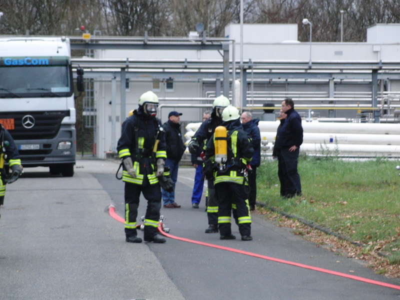 Der Angriffstrupp des LF Libur: Ausgerüstet mit Pressluftatmer und Gasspürgerät unterwegs zur Erkundung. Im Hintergrund: Der leckgeschlagene Tanklastzug,Aus einem mit Gasdruckbehältern beladenen Sattelschlepper tritt Gas unter lautem Zischen aus. Die anwesenden Betreiber der Anlage äußerten gegenüber dem Einsatzleiter, dass es sich bei dem Gas um Kohlenmonoxid (CO), das in Röhrenspeicher umgelagert werden sollte, handelt. Der LKW ist mit einer Gefahrentafel gekennzeichnet, die