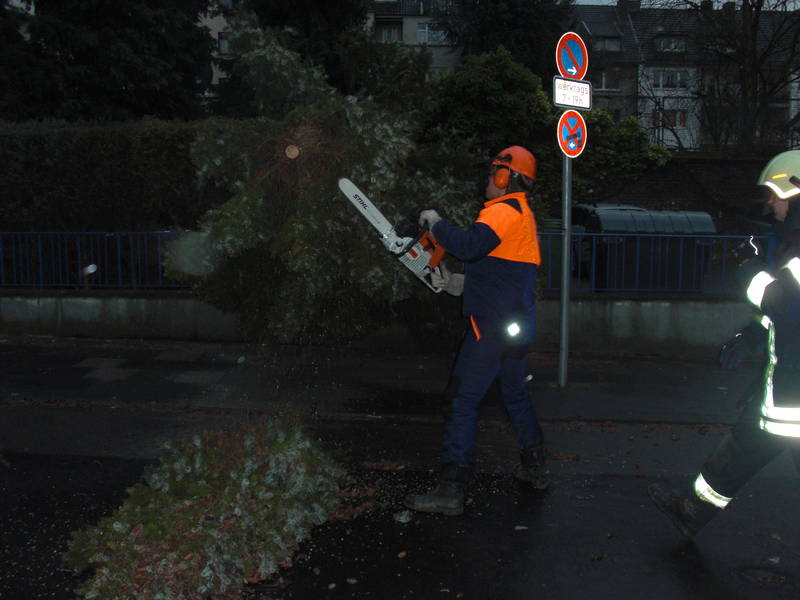 Die Beseitigung eines Baumteiles, das einen Gehweg oder eine Straße versperrt, ist Aufgabe der Feuerwehr.Definitiv fällt jedoch die Beseitigung eines Baumes, der die Freifläche oder den Garten eines Privatgrundstückes „befallen“ hat, nicht zu unseren Aufgaben – dies ist keine Tätigkeit im Rahme der Gefahrenabwehr sondern eher etwas für private Unternehmen. Eines können wir Ihnen dennoch garantieren: Wir kommen, wenn Sie uns rufen. Auch wenn wir nicht zuständig sind, erhalten Sie von uns auf jeden Fall weitere Informationen zu Ihrem Anliegen. Und bitte bedenken Sie auch: Ein Sturm ist kein lokales Ereignis, das nur Sie betrifft. Es gibt in so einer Situation hunderte Einsatzstellen in Köln, die nacheinander abgearbeitet werden. Für ein wenig mehr Geduld wären wir daher manchmal dankbar.