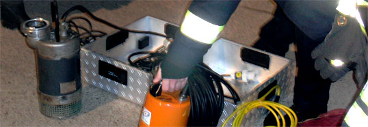 Die Tauchpumpe, hier eine vom Modell Mast TP4, ist eine der Standardwaffen gegen das Wasser.Ist sichergestellt, dass das Wasser keine Gefahren durch anliegende elektrische Spannung oder gelöste Gefahrstoffe birgt, kann man sich gegebenenfalls über die Beseitigung der Wassermassen Gedanken machen. Der Einheitsführer der Feuerwehr muss daher in Erfahrung bringen, ob die ihm zur Verfügung stehenden Pumpen in ihrer Leistung ausreichen, um das zu bewegende Wasservolumen mit vernünftigem Zeitaufwand fördern können. Am Beispiel unseres Löschgruppenfahrzeugs LF 1 (ein LF 10/6) sieht die theoretische, maximale Förderleistung pro Minute so aus: