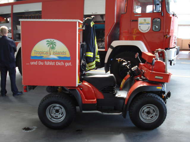 Am letzten Tag unserer Tour gab es eine weitere Attraktion, die nicht für jeden Besucher zugänglich ist. Die Werkfeuerwehr des Tropical Islands lud uns zu einer Besichtigung ihrer Wache und ihres Fuhrparks ein. Durch die Lage der Halle, den großen angrenzenden Waldgebieten im Gelände und der langen Anfahrtszeiten der anderen Feuerwehren ist eine Werkfeuerwehr nötig geworden. Diese nimmt jedoch nicht nur den Brandschutz, sondern auch anderen Aufgaben, wie zum Beispiel die Gebäudesicherheit und die Wartung der Brandschutzeinrichtungen wahr. Besonders zu erwähnen sei hier das selbst ausgebaute Einsatz-Quad mit dem die Wehrleute fast jeden Bereich in der Halle erreichen können um schnelle Löschmaßnahmen einleiten zu können.