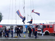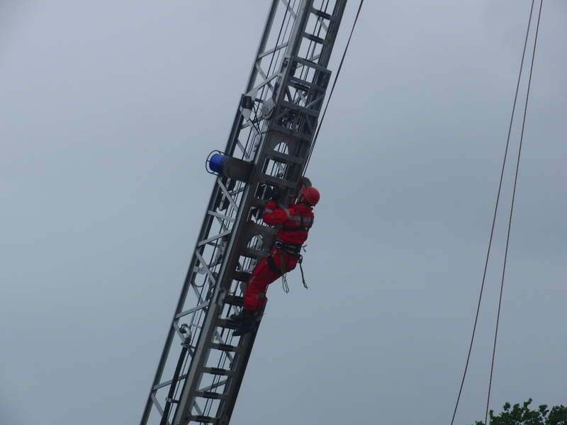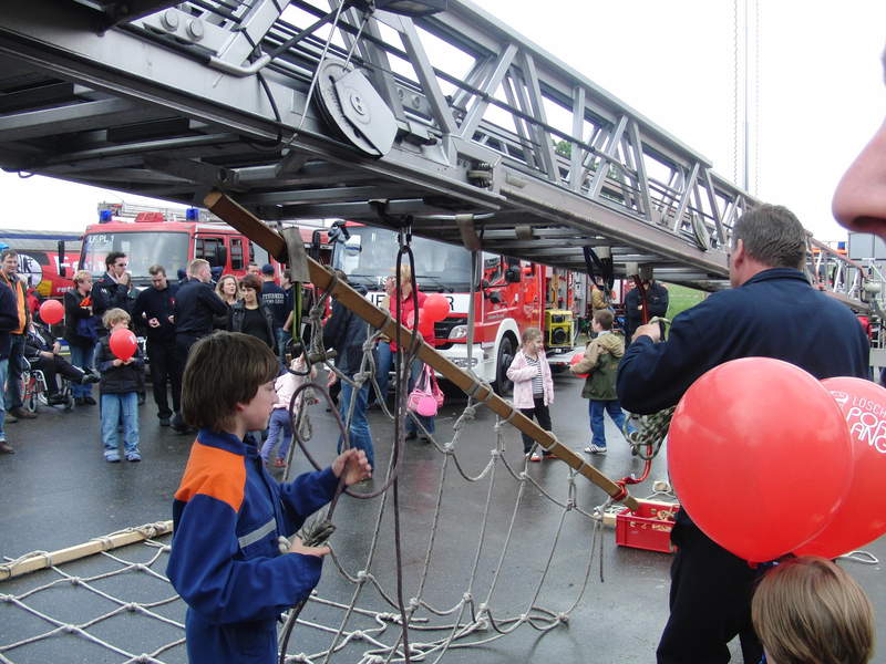 Klettern wie die Höhenretter: Die jungen Gäste versuchen sich am Kletterparcours.Am späteren Nachmittag folgte dann nach einer weiteren kräftigen Regenschauer eine Vorführung zum Thema Patientengerechte Rettung aus verunfallten Kraftfahrzeugen. Die