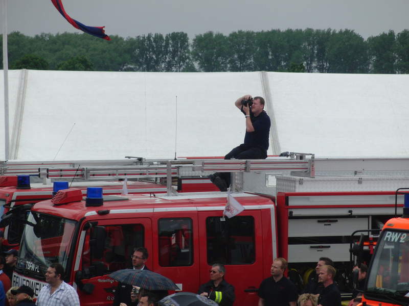 Der Festplatz füllt sich mit Fahrzeugen. Vorne hat sich der Gerätewagen Wasserrettung der Berufsfeuerwehr Köln aufgebaut, dahinter schiebt sich das RIV der Flughafenfeuerwehr Köln/Bonn auf den Platz.