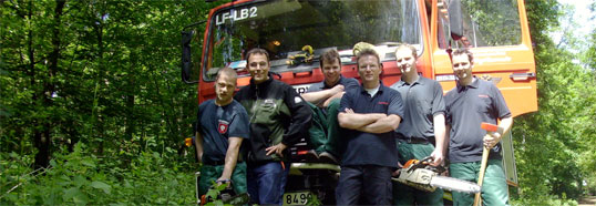 Gruppenfoto fürs Album: Die Teilnehmer der Fortbildung und der Ausbilder.Anders als alle anderen Lehrveranstaltungen der Feuerwehr Köln fand die Fortbildung nicht in der Feuerwehrschule, sondern beim Forstrevier Dünnwald statt. Dort lernten wir direkt vom Profi.