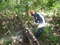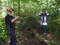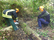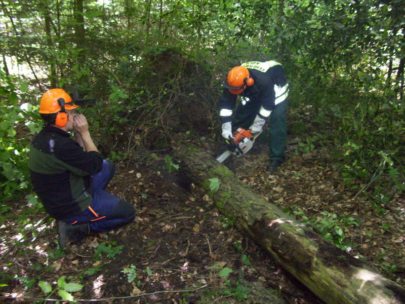 Ein umgestürzter Baum mit Wurzelteller (im Hintergrund) erfordert besondere Vorsicht.Anschließend durfte jeder einige Stücke aus dem Stamm abtrennen. Vorher wurde jedoch jeder Schnitt gemeinsam besprochen. Während des praktischen Teiles wurde die Motorsäge nur ein einziges Mal durch zu hohe Druckkräfte im Holz eingeklemmt, das einen guten Schnitt für einen solchen Lehrgang darstellt.