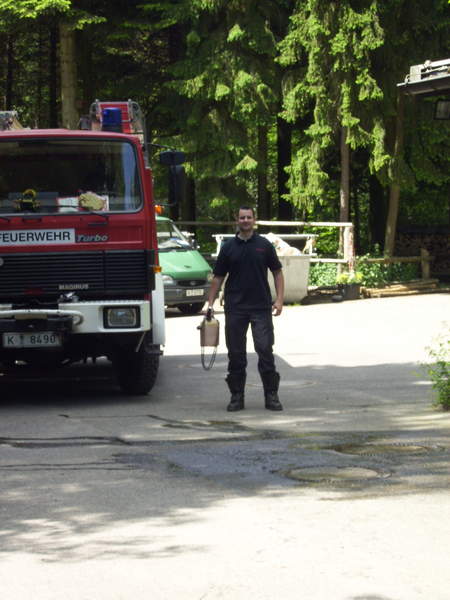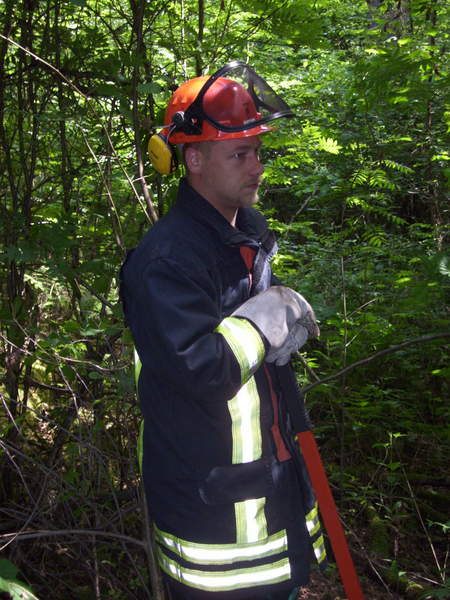 Nachdem jeder von uns im Fotoband der Feuerwehr Köln auf unserem Foto unterschrieben hatte, verbrachten wir den Vormittag mit einer kurz gefassten Theorieeinheit über die Sicherheit beim Arbeiten mit der Motorsäge. Diese ist unerlässlich, da statistisch betrachtet im Berufsbild der Forstwirtschaft jeder Dritte einen Arbeitsunfall erleidet. Außerdem wurde uns die Technik einer Motorsäge sehr anschaulich erklärt. Mit diesem Wissen nahmen wir einige Kniffe mit nach Hause, mit denen wir in Zukunft kleinere Schäden und Fehlfunktionen an der Motorsäge selbst beseitigen können. Nach einer recht kurzen Mittagspause ging es nun endlich zum praktischen Teil des Tages über. Jeder Teilnehmer wurde mit Schnittschutzhose und Helm ausgestattet und Sägen, Werkzeug, Fällheber, Äxte und andere Spielereien eingepackt. Nach einer 30-minütigen Waldrundfahrt fanden wir endlich geeigneten Sturmwurf, der ausreichend verkeilt war, um die Auswirkungen von Druck- und Zugkräften im Holz anschaulich kennenlernen zu können.