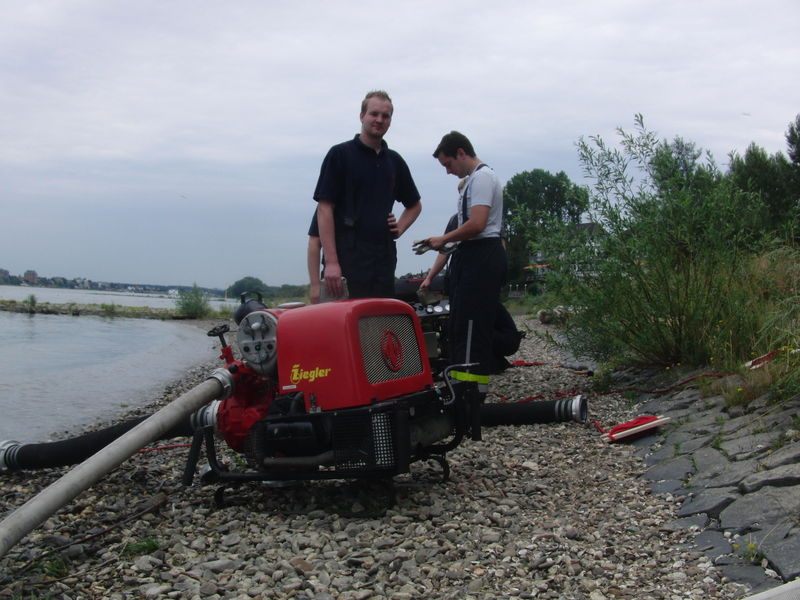 Wasserentnahme aus offenem Gewässer: Wenn kein Hydrant greifbar ist, müssen andere Wasserquellen angezapft werden. Meist bedient man sich dabei einer Kombination aus Saugleitungen und einer Tragkraftspritze.Der Feuerwehr Köln stehen im Stadtgebiet mehrere Löschgruppen bereit, deren Hauptaufgabe eben diese Wasserförderung über lange Wegstrecken ist. Ausgerüstet mit einem Schlauchwagen und den nötigen Pumpen lässt sich so eine Wasserversorgung bereitstellen. Sowohl die Löschgruppe Langel als auch wir haben eigentlich andere Aufgaben (