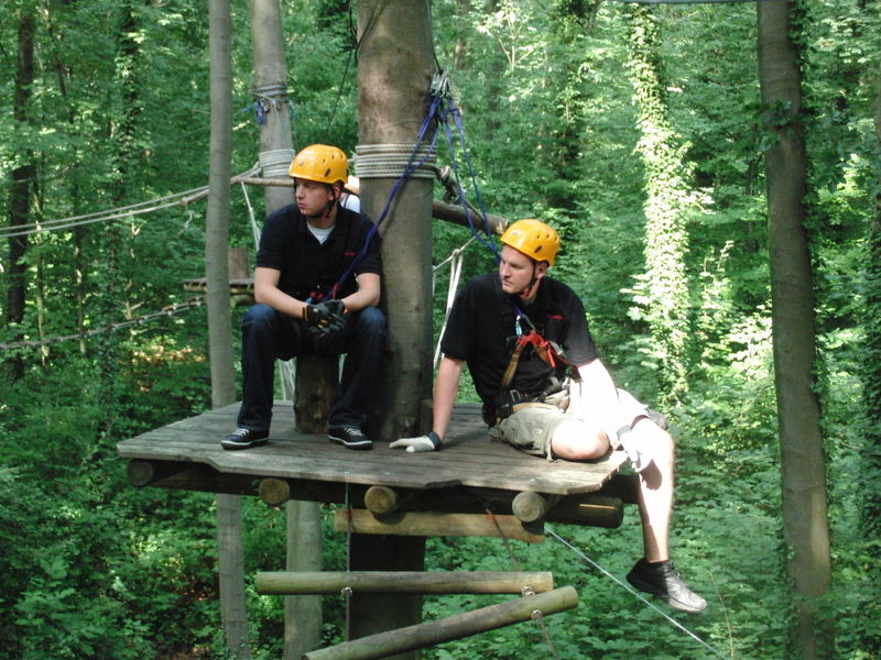 Kurze Pause in den Baumwipfeln: Sind die Kletterelemente belegt, muss man warten – ab dem dritten Parcours tut die Erholung dann auch gut.Im Anschluss daran hangelten wir uns so durch die verschiedenen Parcours, bis wir gegen 18:30 die Heimreise antraten. Im Gerätehaus ließen wir den Tag dann beim gemeinsamen Abendessen noch einmal Revue passieren. Für uns steht fest, dass dies sicher nicht der einzige Besuch im Kletterpark in Brühl war, denn das Programm dort ist bei fairen Preisen reichhaltig und lohnenswert.