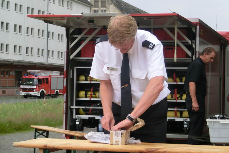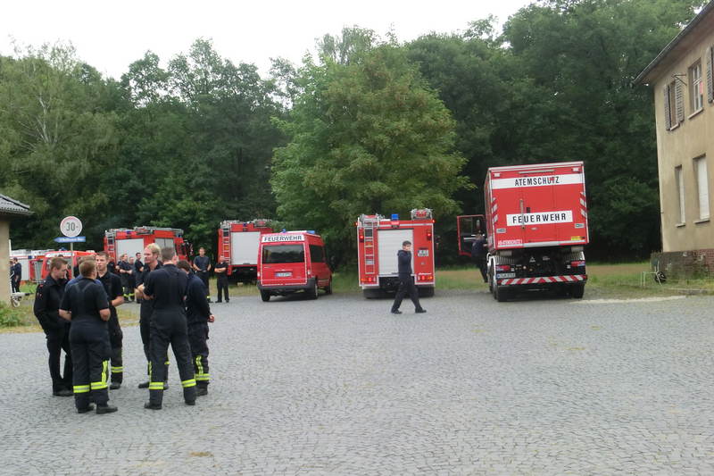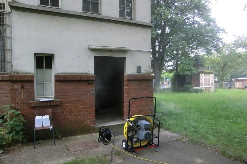 Der Beginn dieser Großübung, die in insgesamt sechs Stationen aufgeteilt war, wurde für 8 Uhr anberaumt und begann nach einer Begrüßung durch die Bereichsleitung des Gefahrenabwehrbereiches Süd mit einem gemeinsamen Frühstück. Im Anschluss daran arbeiteten die Löschgruppen die verschiedenen Stationen ab. Für die Löschgruppe Libur stand als erstes eine praktische Fortbildung zum Thema „taktische Ventilation“ auf dem Programm. Dabei wurde den anwesenden Kameraden vermittelt, wie ein verrauchtes Gebäude im Einsatz möglichst effektiv entraucht werden kann. Hierzu wurde in einem alten Gebäude auf dem Bundeswehr-Gelände in Wahnheide ein Brand simuliert, die Räume mit einer Nebelmaschine verraucht und durch die Einrichtung von Belüftungsöffnungen und unter Einsatz eines Überdrucklüfters schnell wieder rauchfrei gemacht.